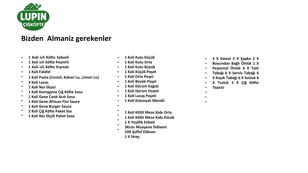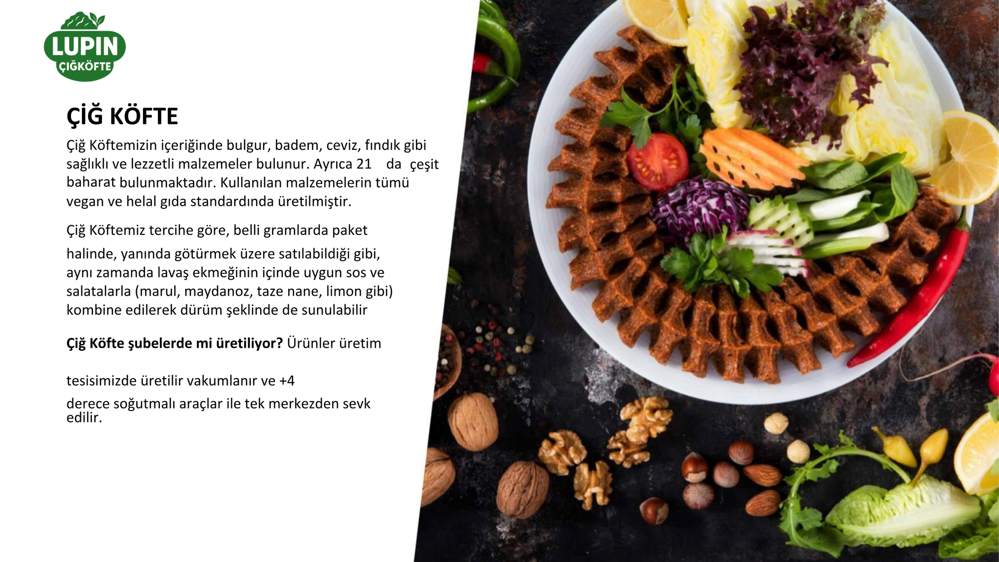 Unser Ziel bei Lupin Çiğköfte ist es, sowohl in der Türkei als auch international die erste Adresse für „gesunde und natürliche Çiğköfte“ zu sein. Mit innovativen Produktionsmethoden und hochwertigen Zutaten streben wir eine führende Rolle in der Branche an.