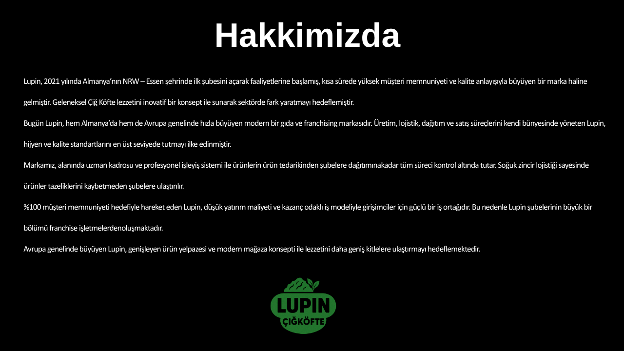 Herzlich willkommen bei Lupin Çiğköfte – wo traditionelle türkische Geschmackserlebnisse auf moderne Qualität treffen. Wir haben es uns zur Aufgabe gemacht, die einzigartige Kultur der Çiğköfte aus allen Regionen der Türkei mit natürlichen Zutaten, hygienischer Herstellung und perfektem Geschmack zu vereinen.